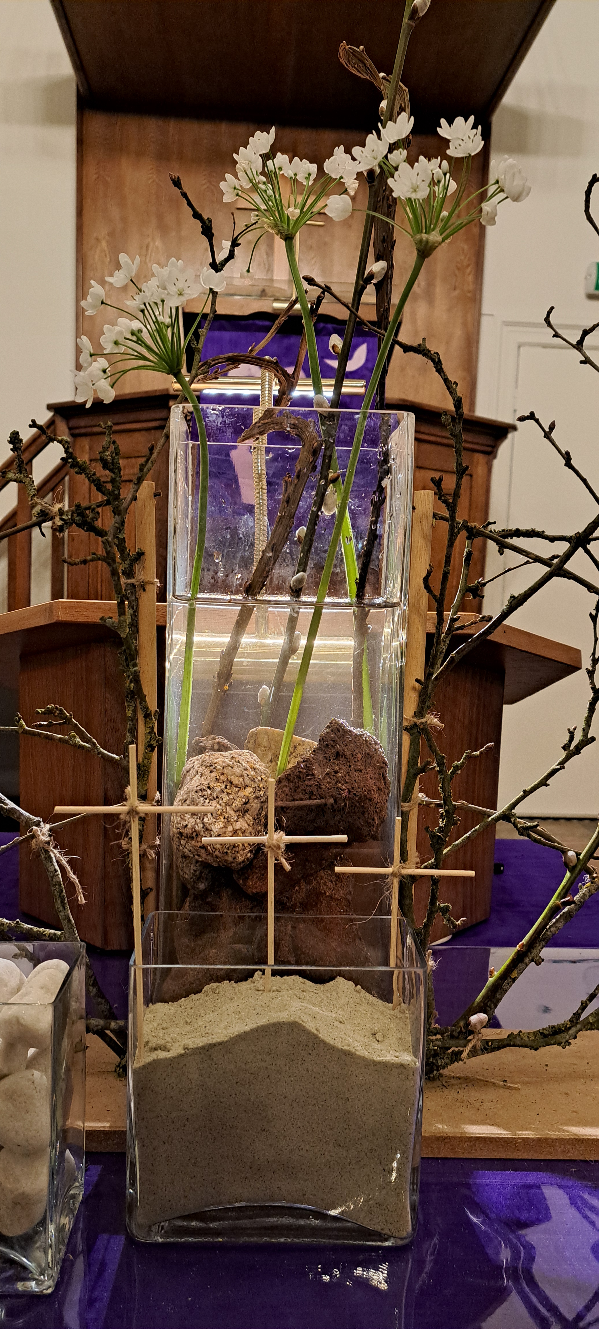 De trouw van God wordt weergeven door de slinger van Hedera die vanaf de paaskaars, over de avondmaalstafel door de schikking loopt en is verbonden met de doopvont.