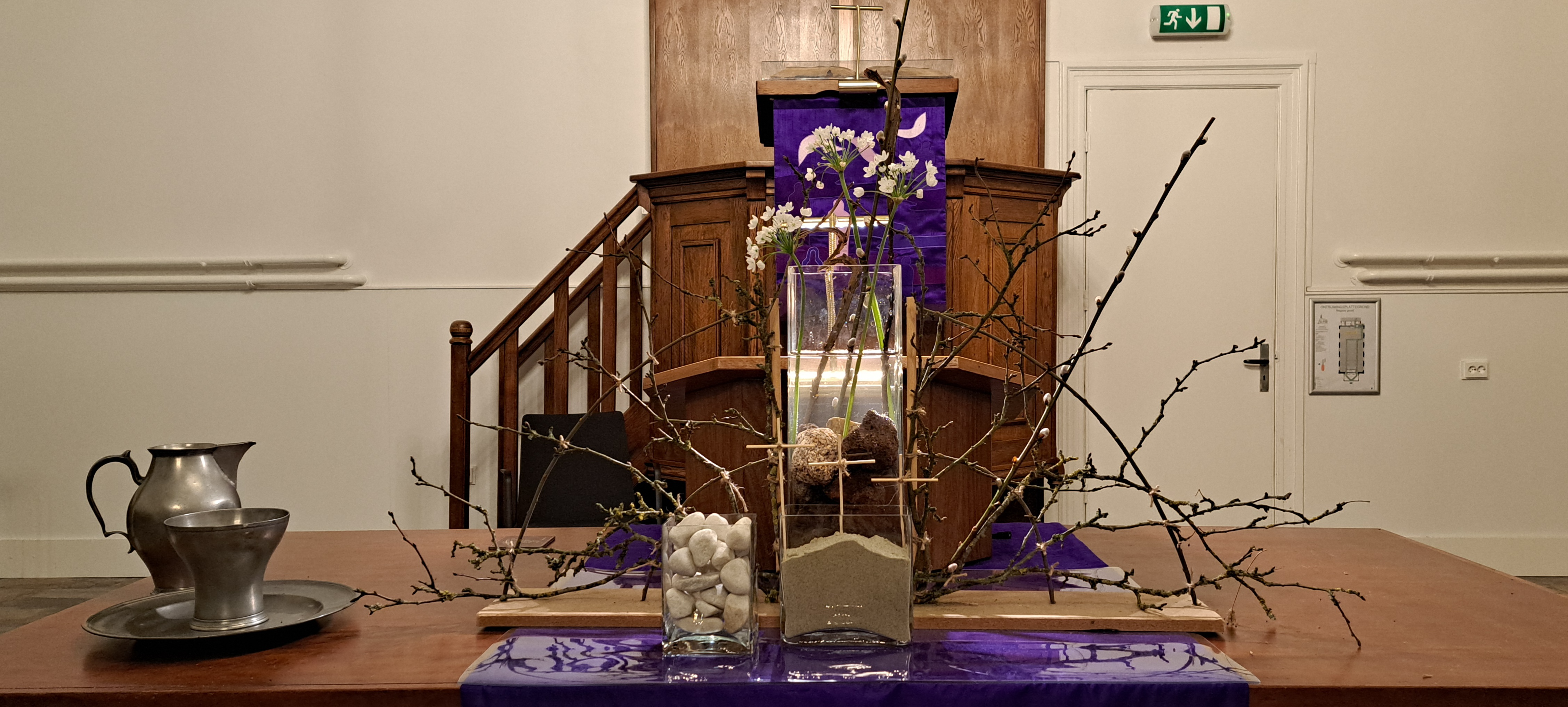 In deze veertigdagentijd, op weg naar Pasen, maken wij vanaf deze zondag tot en met 1ePaasdag een liturgische opbouwschikking in de kerk. Het is vandaag de vierde zondag van de veertigdagentijd, zondag Laetare. Verheug U, ook wel de roze zondag genoemd. Over de statafel ligt een paars kleed. Daarop een lange lap jute als een weg. Paars en jute staan voor bezinning, rust zoeken, soberheid en inkeer waardoor er bij onszelf iets kan ontstaan van binnenuit. Ons leven is een reis, onderweg kom je van alles tegen, doe je allerlei ervaringen op, met vallen en opstaan zoek je je weg naar de toekomst. De open deur staat achteraan op de tafel en verbeeldt: Onvoorwaardelijke liefde. Onvoorwaardelijke liefde die leven geeft en vreugde brengt. De deur is een verwijzing naar Jezus, een open huis waar het goed is om te wonen. Wij mogen door de deur heen, naar de toekomst. Achter de deur staan 6 paarse kaarsen waarvan er iedere zondag één meer mag branden, omdat we dichter bij Pasen komen. Op de tafel een roze kaars die al straalt van vreugde, we zien door het donker al een sprankje licht als verwijzing naar het komende Paasfeest. Op de tafel liggen vijf broden, twee vissen en kruimels brood op het pad. Die verwijzen naar het evangelie van Johannes. Jezus leert ons delen, want als wij dit leren, dan zal er genoeg zijn voor iedereen. We delen dan het leven met de ander. De Hedera, die naar de Paaskaars loopt, geeft Gods trouw weer, Hij houdt ons vast.