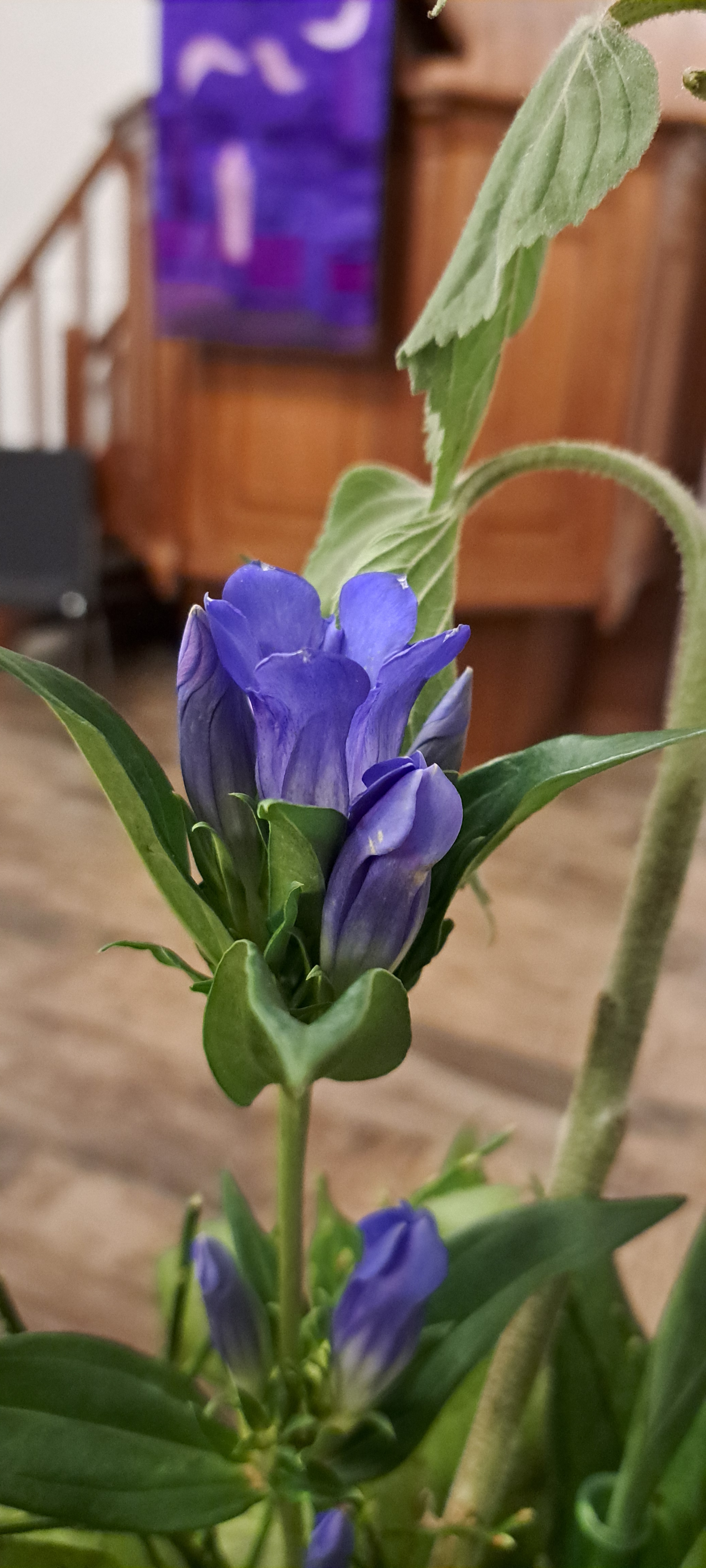 Vandaag vieren het Pinksterfeest. We zijn heel blij dat we vandaag weer met een aantal gemeenteleden deze dienst mogen beleven. Daarom hebben we ook een schikking gemaakt naast het kruis in het voorportaal. De kleuren van de bloemen die we daar hebben verwerkt komen overeen met de bloemen van de schikking.