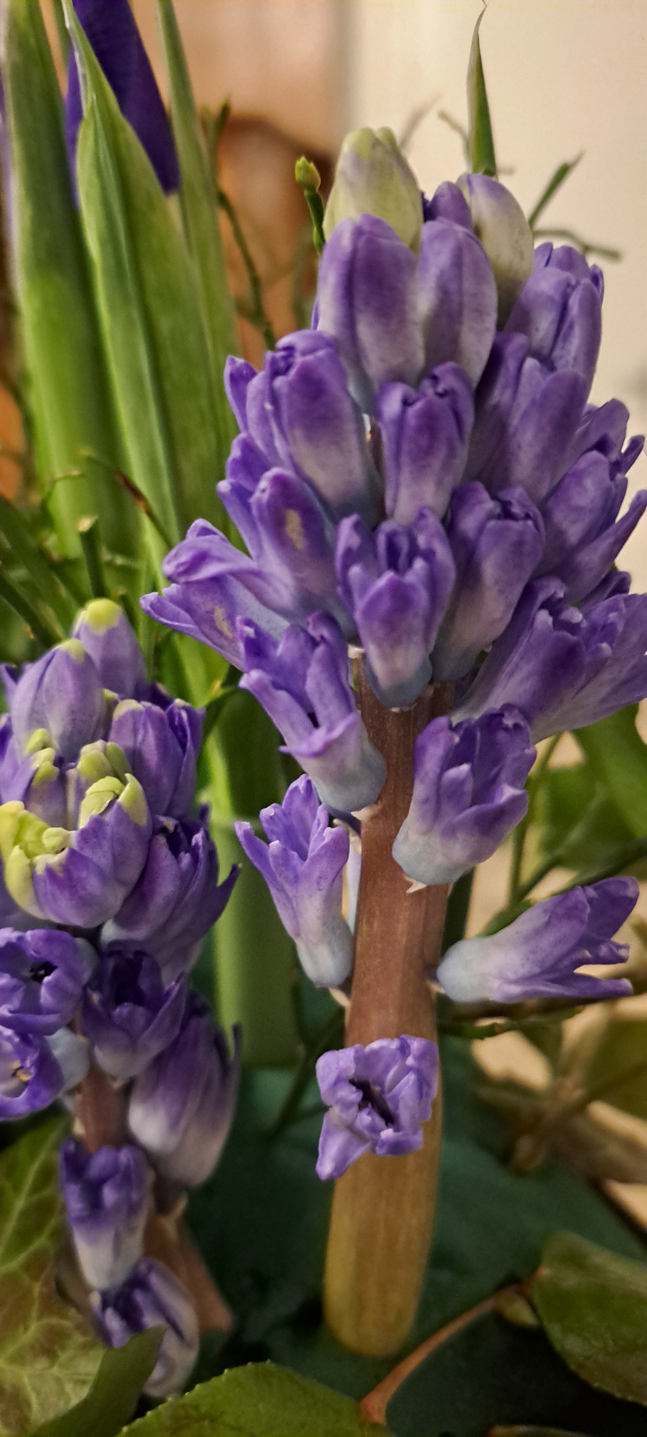 De flessen zijn gevuld met allerlei takken en voorjaarsbloeiers, als symbool voor het nieuwe leven. Vanaf de Paaskaars slingert de Hedera naar de schikking, als teken van Gods trouw.