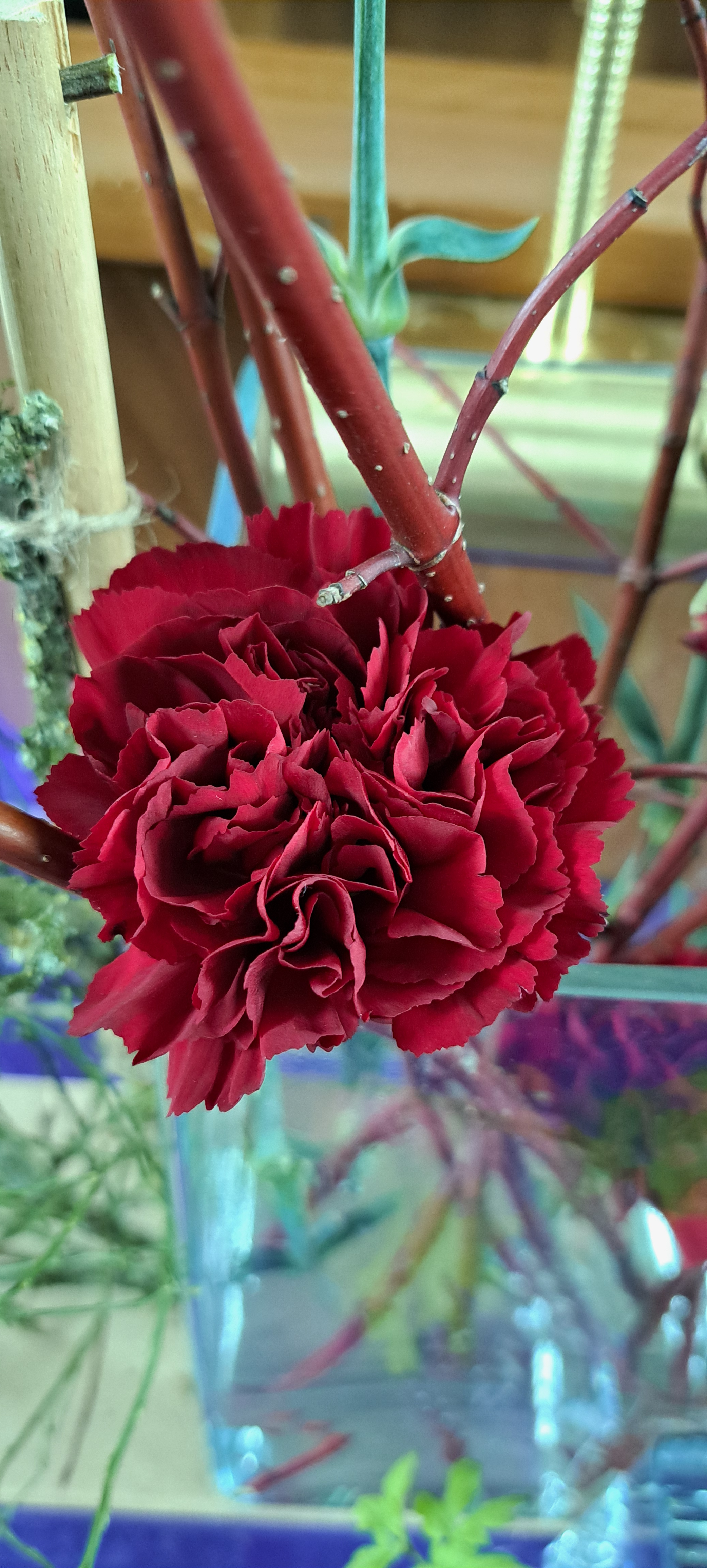 Op iedere windrichting zijn twee takken door de schikking gestoken, de takken steunen op de krans met gipskruid, maar steken hier ook bovenuit. De tak is een verwijzing naar Marcus 3, waarin de discipelen de opdracht krijgen niets mee te nemen, behalve een stok. Een stok is om op te steunen, je kunt er ook dingen mee dragen én je kunt hem gebruiken ter bescherming. Alle gemeenteleden zijn ambtsdragers, maar diakenen en ouderlingen zijn bijzondere ambstdragers, zij zijn geroepen om de gemeente als geheel te laten functioneren en dragen daarmee een extra verantwoordlijkheid. Dit verschil hebben we willen benadrukken door aan elke tak een kleine schikking met bloemen te hangen.