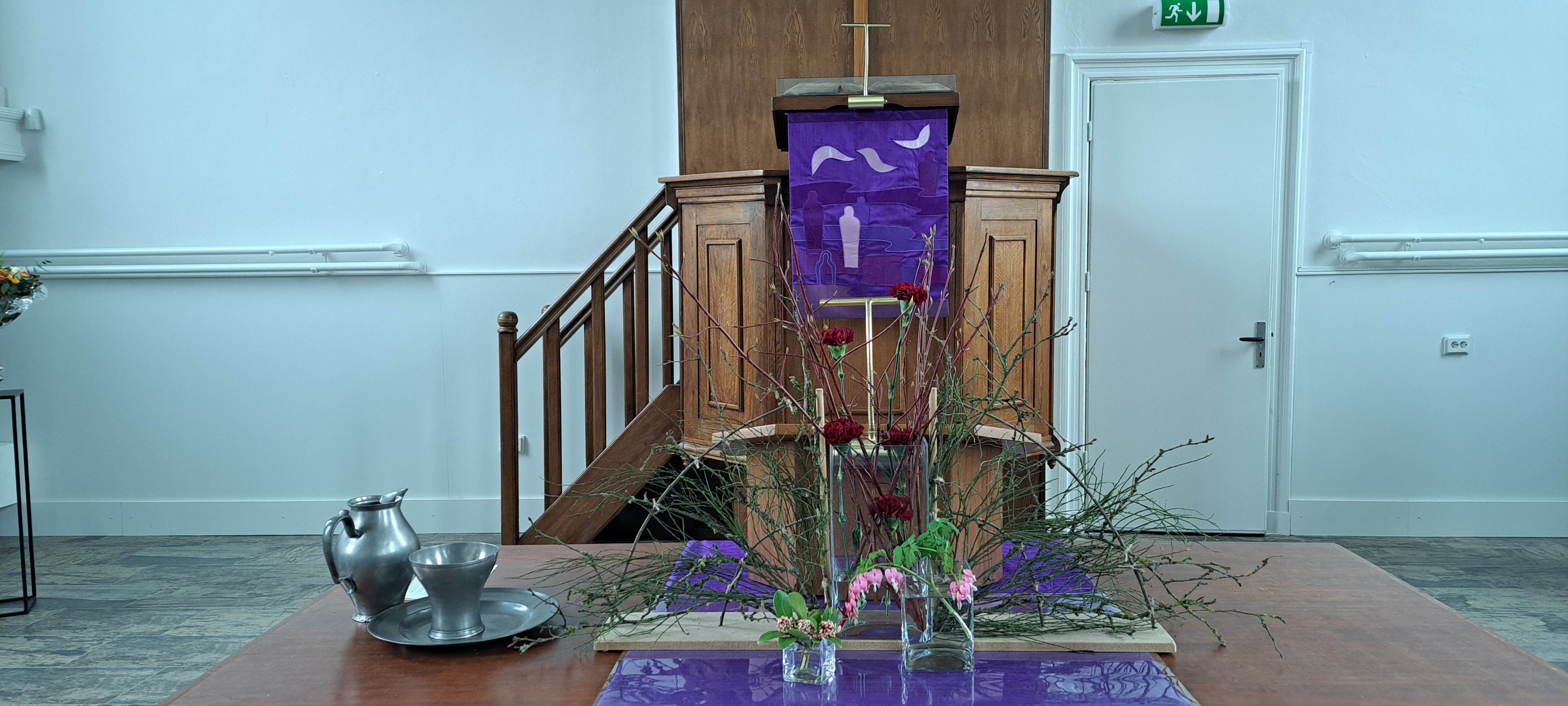 In deze veertigdagentijd, op weg naar Pasen, maken wij tot en met eerste Paasdag een liturgische opbouwschikking in de kerk. Het is vandaag de zesde zondag van de veertigdagentijd. Over de statafel ligt een paars kleed. Daarop een lange lap jute als een weg. Paars en jute staan voor bezinning, rust zoeken, soberheid en inkeer waardoor er bij onszelf iets kan ontstaan van binnenuit. Ons leven is een reis, onderweg kom je van alles tegen, doe je allerlei ervaringen op, met vallen en opstaan zoek je je weg naar de toekomst. De open deur staat achteraan op de tafel en verbeeldt: Onvoorwaardelijke liefde. Onvoorwaardelijke liefde die leven geeft en vreugde brengt. De deur is een verwijzing naar Jezus, een open huis waar het goed is om te wonen. Wij mogen door de deur heen, naar de toekomst. Achter de deur staan zes paarse kaarsen waarvan er iedere zondag één meer mag branden, omdat we dichter bij Pasen komen.